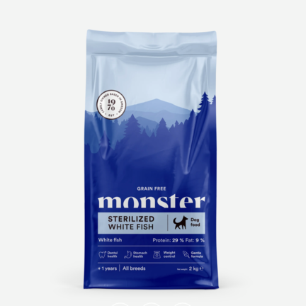 Monster Grain Free Sterilized White Fish kombinerer vægtkontrol med høj kvalitet og naturlige ingredienser.